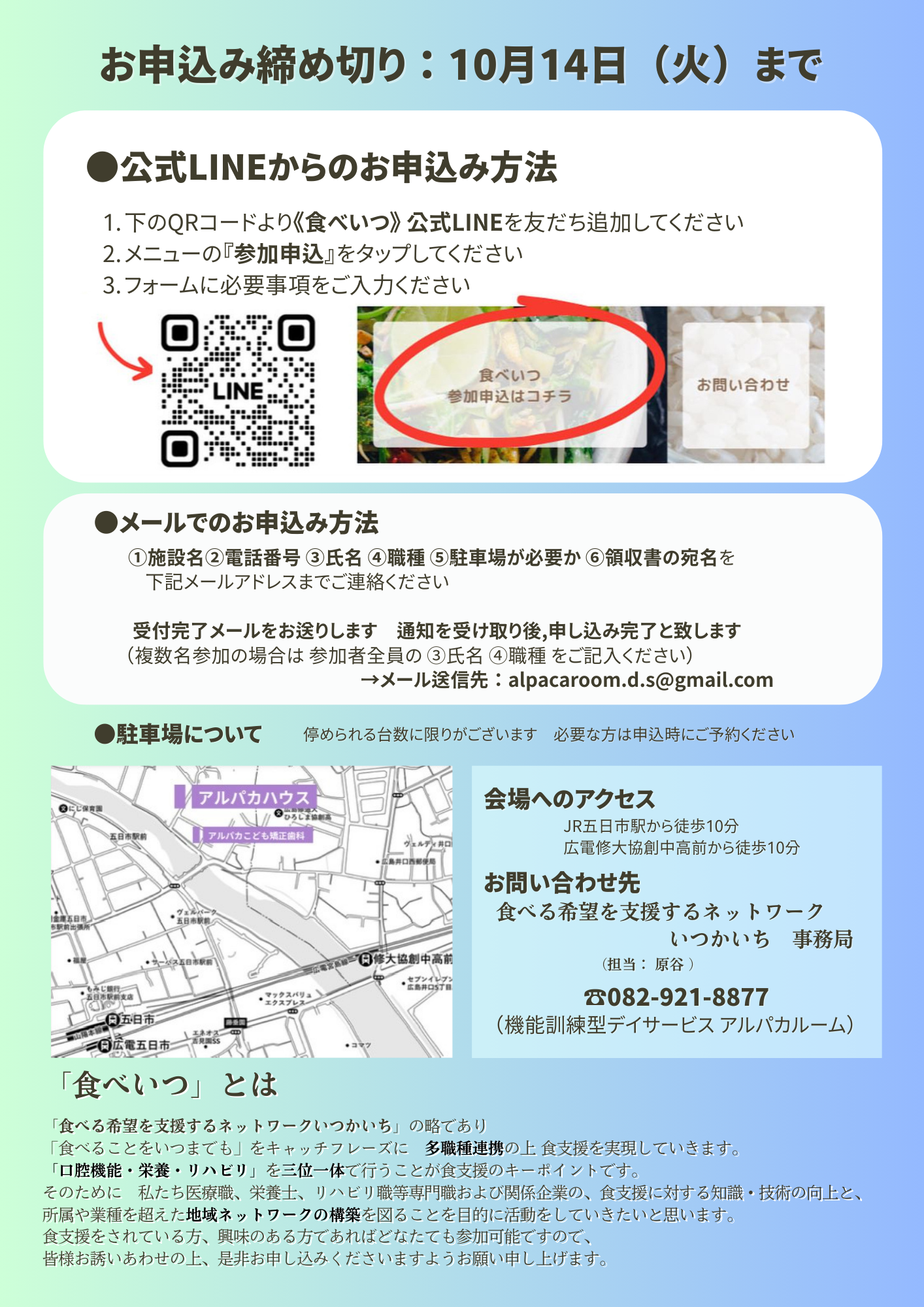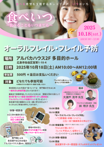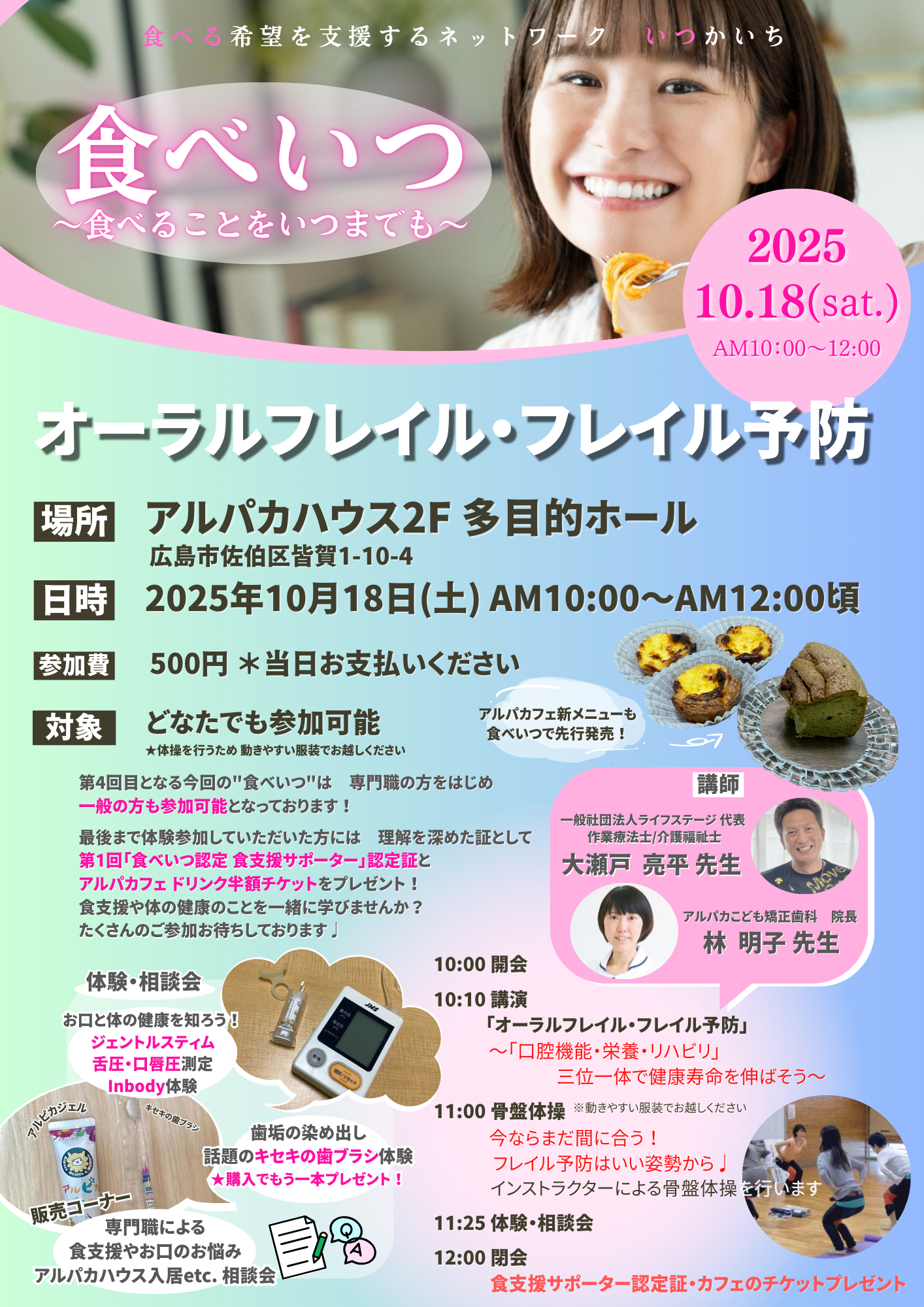 【食べいつ】食べる希望を支援するネットワークいつかいち~食べることをいつまでも~:2025年10月18日10時~12時inアルパカハウス2階『オーラルフレイル・フレイル予防』をテーマに講演・骨盤体操・体験イベントを開催します!専門職の方をはじめ地域の皆様もぜひご参加ください!詳細は案内チラシをご覧ください★